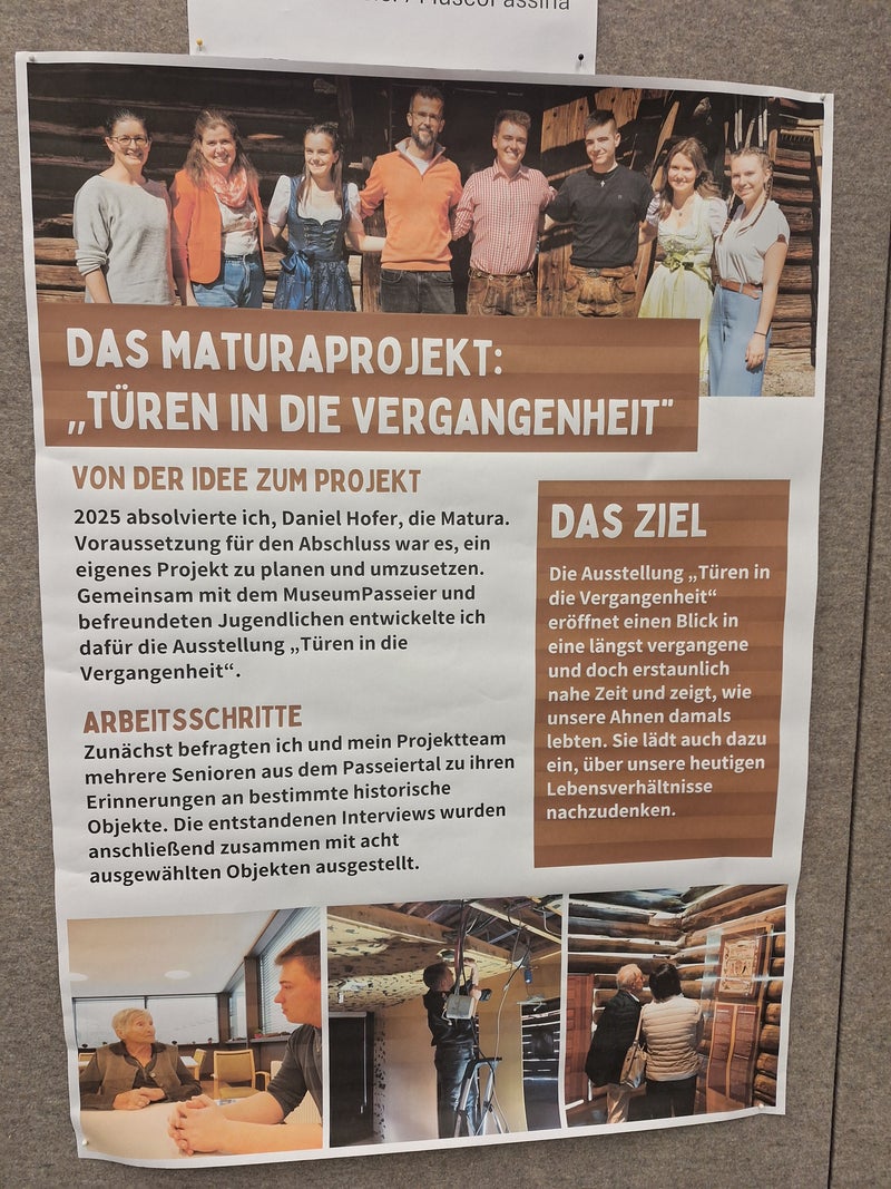 - Il poster con cui il Museo dell'Alta Passiria ha partecipato alla sessione poster. Il diplomando Daniel Hofer presenta il suo progetto “Porte sul passato”, in cui ha intervistato diversi anziani della Val Passiria sui loro ricordi legati a determinati oggetti storici. (Foto: USP/Verena Girardi) » [IMG 4 MB]